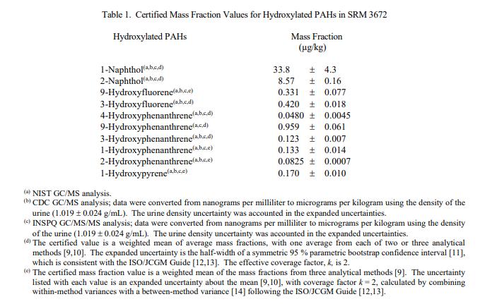 表 1 中提供了羥基化 PAH 的認證質量分數值。 NIST 認證值是 NIST 對其準確性具有最高置信度的值,因為所有已知或可疑的不確定性來源都已被調查或考慮在內帳戶 [1]。認證值基于 NIST、CDC 和魁北克國家公共衛生研究所 (INSPQ) 獲得的結果一致。