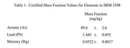 表 1 提供了 SRM 3398 中基于干質量報告的痕量元素認證質量分數值。NIST 認證值是 NIST 對其準確性有最高信心的值已知或可疑的偏倚來源已被調查或考慮 [1]。價值分配分析由 NIST 和合作實驗室進行。認證值計算為 NIST 方法平均值的未加權平均值和合作實驗室平均值的加權中值(在適當的情況下)。相關的不確定性以大約 95% 的置信水平表示 [2-5]。