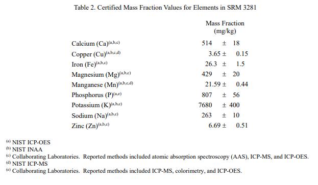 表 1 和表 2 中提供了以干質量為基礎報告的奎尼酸和元素的認證質量分數(shù)值。NIST 認證值是 NIST 對其準確性有最高置信度的值所有已知或可疑的偏差來源都已被考慮在內 [1]。價值分配分析由 NIST 和合作實驗室進行。認證值計算為