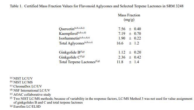 NIST SRM 3248銀杏片(標(biāo)準(zhǔn)品)NIST 參考值是未經(jīng)認(rèn)證的值,它是基于可用數(shù)據(jù)對真實(shí)值的最佳估計(jì);但是,該值不符合 NIST 的認(rèn)證標(biāo)準(zhǔn) [1],并帶有相關(guān)的不確定性,這些不確定性可能僅反映測量再現(xiàn)性,可能不包括所有不確定性來源,或者可能反映多種分析方法之間缺乏足夠的統(tǒng)計(jì)一致性。表 3 中提供了其他萜內(nèi)酯的參考濃度值。表 4 中提供了砷、鎘和汞的參考值。