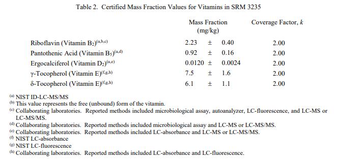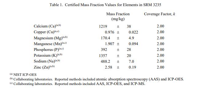 表 1 和表 2 提供了 SRM 3235 中元素和維生素的認(rèn)證質(zhì)量分?jǐn)?shù)值,按原樣報(bào)告,在表 1 和表 2 中提供。 NIST 認(rèn)證值是 NIST 對(duì)其最有信心的值準(zhǔn)確性,因?yàn)樗幸阎蚩梢傻钠顏?lái)源都已被調(diào)查或考慮到[1]。價(jià)值分配分析由 NIST 和合作實(shí)驗(yàn)室進(jìn)行。認(rèn)證值被計(jì)算為 NIST 方法的平均值和合作實(shí)驗(yàn)室提供的結(jié)果平均值的中位數(shù)或平均值(在適當(dāng)?shù)那闆r下)。相關(guān)的不確定性以大約 95% 的置信水平表示 [2-4]。