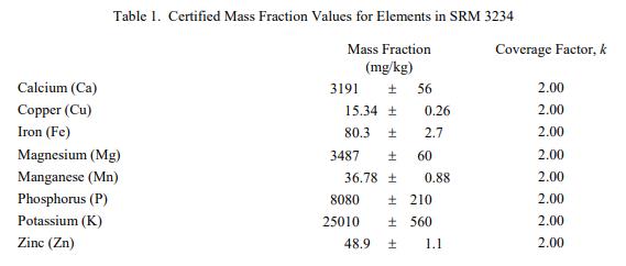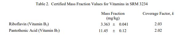 表 1 和表 2 提供了 SRM 3234 中元素和維生素的認(rèn)證質(zhì)量分?jǐn)?shù)值,以干質(zhì)量為基礎(chǔ)報(bào)告。NIST 認(rèn)證值是 NIST 對其準(zhǔn)確性有最高置信度的值因?yàn)樗幸阎蚩梢傻钠妬碓炊家驯徽{(diào)查或考慮 [1]。價(jià)值分配分析由 NIST 和合作實(shí)驗(yàn)室進(jìn)行。認(rèn)證值計(jì)算為 NIST 方法的平均值和合作實(shí)驗(yàn)室提供的平均結(jié)果的中位數(shù)(在適當(dāng)?shù)那闆r下)。所有值在沒有加權(quán)的情況下合并。相關(guān)的不確定性以大約 95% 的置信水平表示 [2-4]。