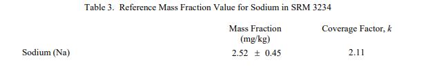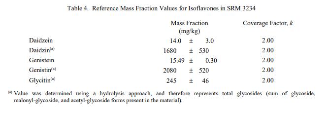 表 3 到表 6 提供了NIST SRM 3234豆粉(標(biāo)準(zhǔn)品) 中鈉、異黃酮、近似物、總膳食纖維、卡路里和氨基酸的參考質(zhì)量分?jǐn)?shù)值,以干質(zhì)量為基礎(chǔ)報(bào)告。NIST 參考值是未經(jīng)認(rèn)證的值,它是基于可用數(shù)據(jù)對真實(shí)值的最佳估計(jì);但是,該值不符合 NIST 認(rèn)證標(biāo)準(zhǔn) [1],并且提供的不確定度可能僅反映測量再現(xiàn)性,可能不包括所有不確定性來源,或者可能反映多種分析方法之間缺乏足夠的統(tǒng)計(jì)一致性。參考質(zhì)量分?jǐn)?shù)值來自 NIST 或合作實(shí)驗(yàn)室報(bào)告的結(jié)果。