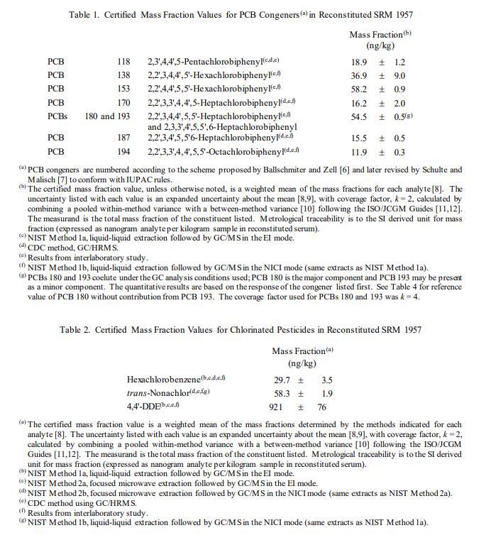 表 1、2 和 3 分別提供了選定 PCB 同系物、氯化農(nóng)藥和 PBDE 同系物以及一種多溴聯(lián)苯同系物的認(rèn)證值,以質(zhì)量分?jǐn)?shù)表示。 NIST 認(rèn)證值是 NIST 對其準(zhǔn)確性具有最高置信度的值,因為所有已知或可疑的偏差來源都已被調(diào)查或考慮在內(nèi) [1]。 PCB 同系物、氯化農(nóng)藥和 PBDE 同系物的認(rèn)證值基于 NIST 使用一種或多種分析技術(shù)獲得的結(jié)果的一致性,以及來自 CDC 和使用不同的分析技術(shù)進(jìn)行實驗室間研究。數(shù)值是基于以質(zhì)量分?jǐn)?shù)為單位的重構(gòu)血清報告的 [2]。