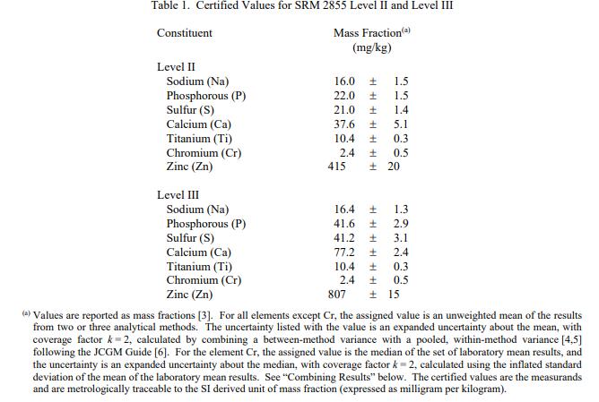 表 1 報告了 SRM 2855 II 級和 III 級成分的認證值。賦值類別基于 NIST 用于化學參考材料的術語和模式的定義 [1]。 NIST 認證值是 NIST 對其準確性有最高置信度的值,因為所有已知或可疑的偏差來源都已被調查或考慮在內。認證值根據 NIST 和合作實驗室使用儀器測試方法進行的分析結果,提供對真實值的最佳估計。