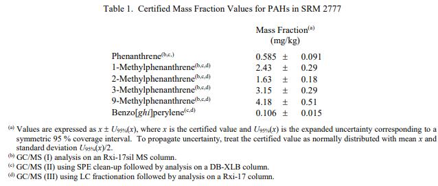 表 1 中提供了 PAH 的認(rèn)證質(zhì)量分?jǐn)?shù)值。 NIST 認(rèn)證值是 NIST 對其準(zhǔn)確性有最高置信度的值,因?yàn)樗幸阎蚩梢傻钠顏碓炊家颜{(diào)查或考慮在內(nèi)[1]。認(rèn)證值基于 NIST 使用多種分析技術(shù)獲得的結(jié)果的一致性。