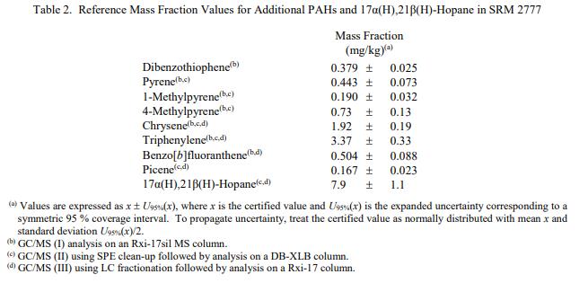 表 2 中提供了額外 PAH 和 17α(H),21β(H)-藿烷的參考質(zhì)量分?jǐn)?shù)值。參考值是未經(jīng)認(rèn)證的值,是對真實(shí)值的估計(jì)。