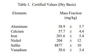 表 1 中提供了認證值,以干基的質量分數 [1] 表示。NIST 認證值是 NIST 對其準確性有最高置信度的值,因為所有已知或可疑來源NIST 已經調查或解釋了偏差。鋁、鈣、鐵、鎳和釩的認證值基于兩種獨立的 NIST 方法。硫的認證值基于單一的 NIST 主要方法。