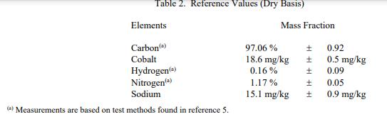 表 2 中提供了以干基質量分數表示的參考值。鈷和鈉的參考值基于單一 NIST 方法。碳、氫和氮的值基于 LECO 公司(密歇根州圣約瑟夫)執行的單一方法,并得到實驗室質量服務國際代表 NIST 管理的實驗室間分析研究結果的證實。參考值是對真實值的最佳估計的非認證值;但是,這些值不符合 NIST 認證標準,并且提供了相關的不確定性,這些不確定性可能僅反映測量精度,可能不包括所有不確定性來源。