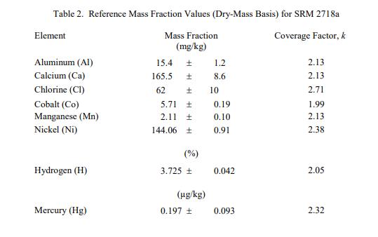 表 2 中提供了鋁、鈣、氯、鈷、氫、汞、錳和鎳的參考值,以基于干質(zhì)量的質(zhì)量分?jǐn)?shù) [1] 表示。參考值是對真實(shí)價(jià)值的最佳估計(jì)的非核證價(jià)值;但是,該值不符合 NIST 的認(rèn)證標(biāo)準(zhǔn),并且提供了相關(guān)的不確定性,該不確定性可能僅反映測量精度,可能不包括所有不確定性來源 [2]。