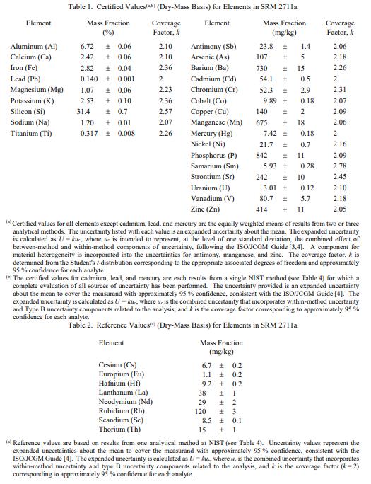 表 1 中提供了元素的認證濃度,以基于干質量的質量分數 [1] 表示。認證值基于通過嚴格評估的獨立分析技術獲得的結果。 NIST 認證值是 NIST 對其準確性具有最高置信度的值,因為所有已知或可疑的偏差來源都已被調查或考慮在內 [2]。被測量是表 1 中報告的元素的總濃度。計量溯源性為 SI 質量單位,表示為導出的質量分數單位。