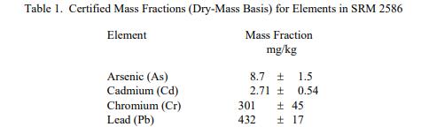 表 1 中提供了四種對環境重要的元素的認證質量分數值。NIST 認證值是 NIST 對其準確性有最高置信度的值,因為所有已知或可疑的偏差來源都已調查或由 NIST [2] 解釋。被測量是表 1 中元素的認證質量分數,在計量上可追溯到 SI 質量分數單位以毫克每公斤表示。