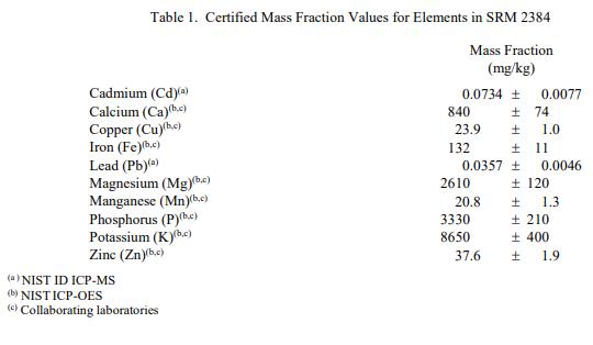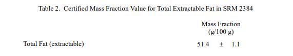 表 1 和表 2 中提供了 SRM 2384 中元素和脂肪的認證質量分數值。NIST 認證值是 NIST 對其準確性的最高置信度值,因為所有已知或可疑的偏差來源已考慮[1]。進行了價值分配分析由 NIST 和合作實驗室提供。認證的質量分數值計算為 NIST 方法的平均值和合作實驗室進行的平均測量值的中位數或平均值(如果適用)。相關的不確定性以大約 95% 的置信水平表示 [2,3]。數值以質量分數單位 [4] 以原樣(非干質量)為基礎報告。
