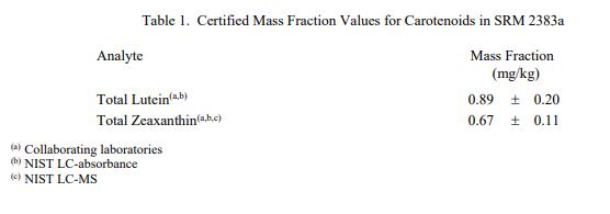 表 1 和表 2 中提供了 SRM 2383a 中類胡蘿卜素和元素的認證質量分數值,按原樣報告。NIST 認證值是 NIST 對其準確性有最高置信度的值因為所有已知或可疑的偏見來源都已被調查或考慮到[1]。價值分配分析由 NIST 和合作實驗室進行。認證值計算為 NIST 方法平均值的未加權平均值和合作實驗室提供的結果平均值的中位數(如果適用)。相關的不確定性以大約 95% 的置信水平表示 [2-4]。