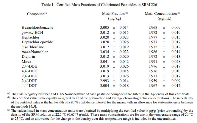 表 1 給出了 15 種農(nóng)藥中 13 種農(nóng)藥的認(rèn)證質(zhì)量分?jǐn)?shù)和估計(jì)不確定度。這些值基于該溶液的重量法制備中使用的數(shù)量以及使用氣相色譜法獲得的分析結(jié)果(GC) 并以質(zhì)量分?jǐn)?shù)單位報(bào)告 [1]。 NIST 認(rèn)證值是 NIST 對(duì)其準(zhǔn)確性具有最高置信度的值,因?yàn)樗幸阎蚩梢傻钠顏?lái)源都已被調(diào)查或考慮在內(nèi) [2]。被測(cè)量是表 1 中列出的農(nóng)藥,認(rèn)證值在計(jì)量上可追溯至以微克/千克表示的質(zhì)量分?jǐn)?shù)的 SI 派生單位。