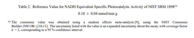 表 1 提供了使用單參數 BET 方程的線性形式進行的多點 (MP) 和單點 (SP) 數據分析的認證值。尼古丁腺嘌呤二核苷酸的參考值水合物 (NADH) 等效比光催化活性見表 2。晶相含量和微晶尺寸的信息值分別列于表 3 和表 4。表 5 中給出了元素組成和純度的信息值。其他信息值包括粒子表征。附錄 B 總結了用于毒性測定的經過驗證的分散方案。賦值類別基于 NIST 用于化學參考物質 [1] 的術語和模式的定義,不確定性根據 ISO/JCGM 指南 [2] 進行評估,3],除非另有說明。