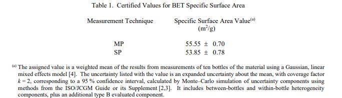 此 SRM 已通過可追溯至 ISO 9277:2010 的不連續測壓測量技術在液氮溫度 (77.3 K) 下通過氮氣吸附測定的 Brunauer-Emmet-Teller (BET) 比表面積認證。